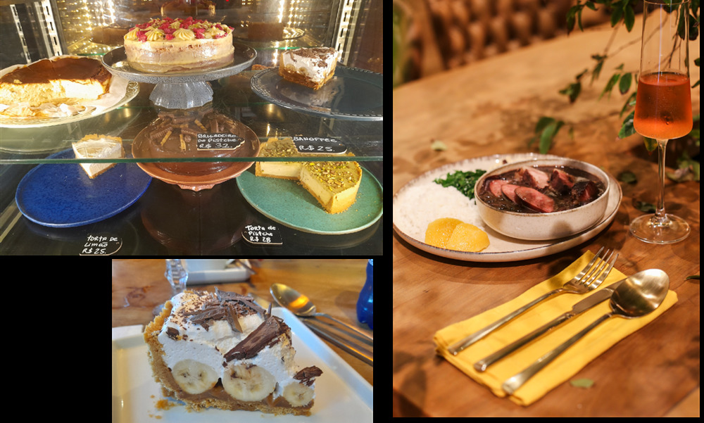 A vitrine de tortas, a torta banoffi e a feijoada de sabor secreto Fotos: Ines Rozario