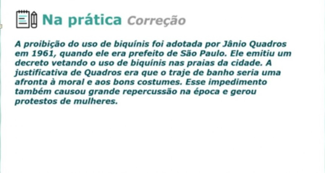 "A proibição do uso de biquínis foi adotada por Jânio Quadros em 1961, quando ele era prefeito de São Paulo. Ele emitiu um decreto vetando o uso de biquínis nas praias da cidade. A justificativa de Quadros era que o traje de banho seria uma afronta à moral e aos bons costumes. Esse impedimento também causou grande repercussão na época e gerou protestos de mulheres".