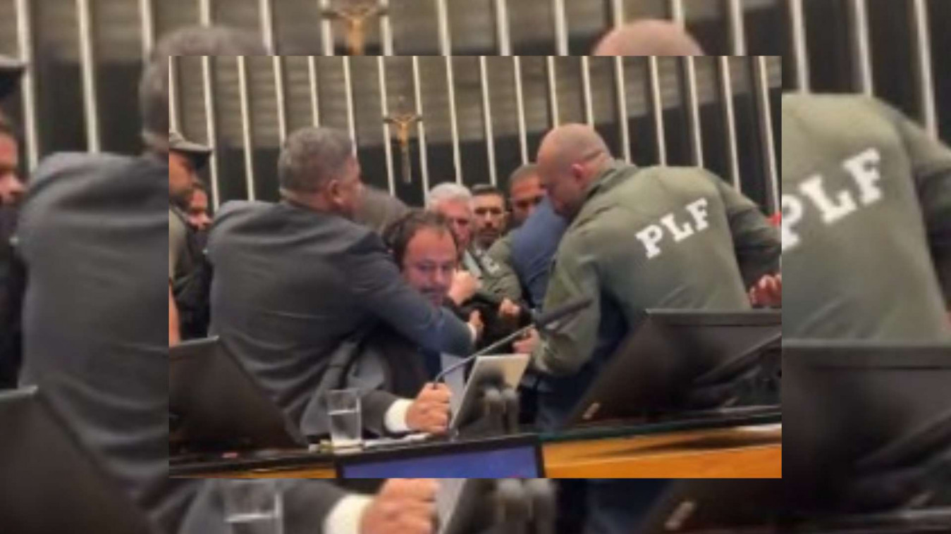 O deputado Glauber Braga foi retirado à força do plenário pela Polícia Legislativa, por ordem do presidente Hugo Motta Foto: reprodução