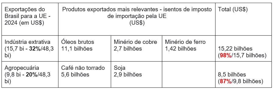 Nossa balança comercial com os europeus é uma espécie de espelho invertido. Em 2024, do total exportado para a UE (US$ 48,3 bilhões), 52% foram de produtos da indústria extrativa (32%) e da agropecuária (20%). Destas, a quase totalidade dos produtos já é isenta de imposto de importação na UE (5).