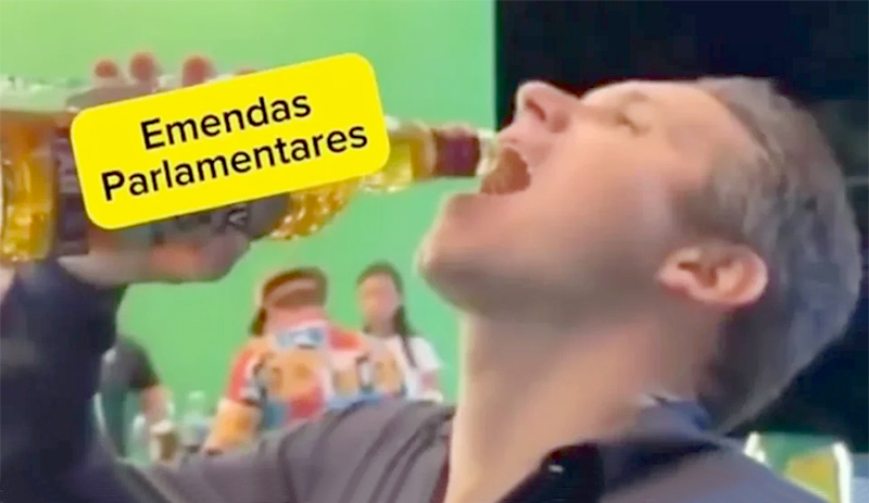 O presidente da Câmara, Hugo Motta, em meme nas redes sociais. A cena da bebeção de uísque no gargalo é verdadeira Foto: reprodução