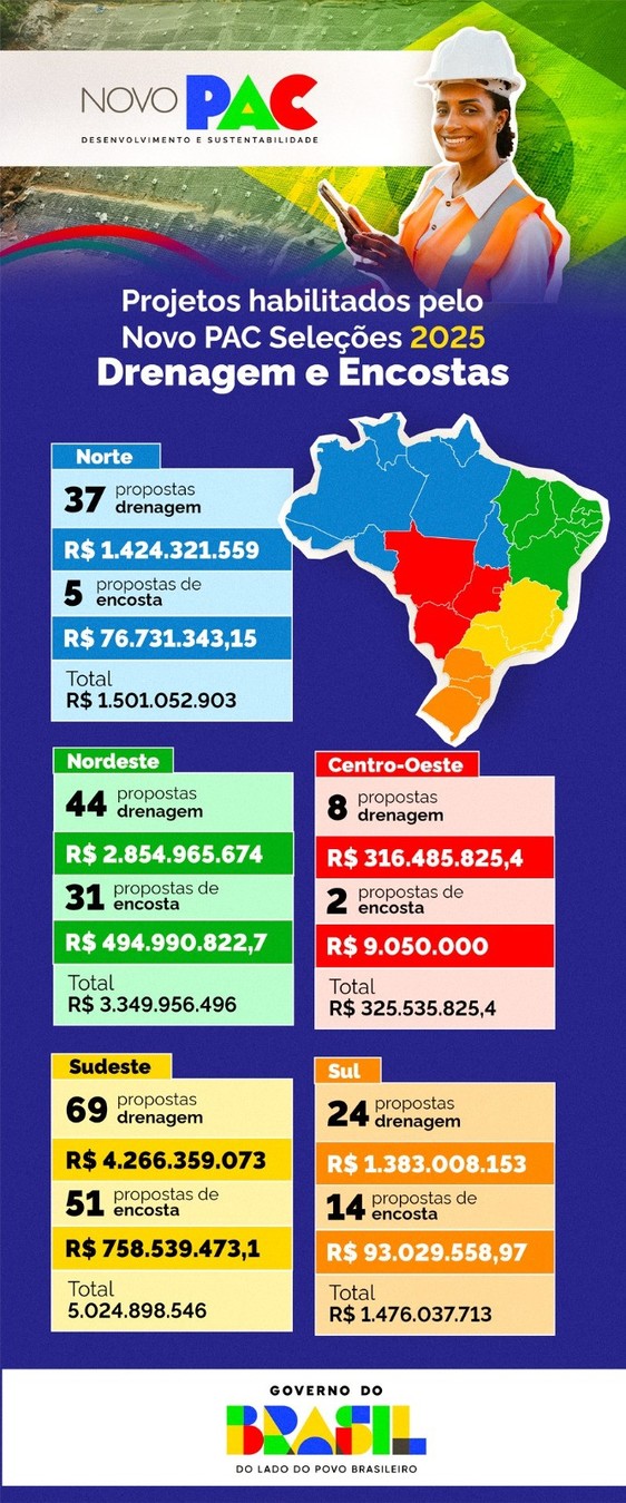 A partir deste resultado, o Novo PAC está investindo mais de R$ 25,8 bilhões em mais de 600 obras de drenagem e contenções de encostas selecionadas nas etapas de 2023-24 e de 2025.