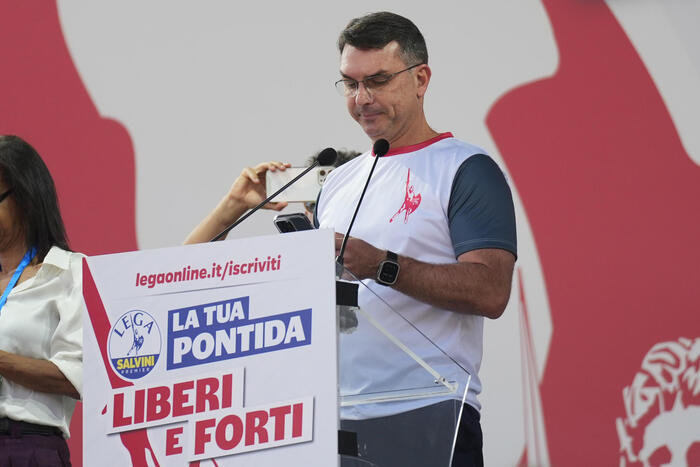 Flávio Bolsonaro discursou em evento do do partido ultranacionalista Liga, em Pontida Foto: Ansa