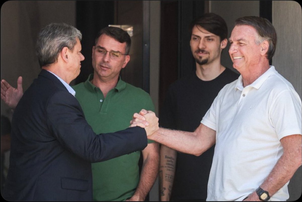Bolsonaro sorridente com os filhos recebendo Tarcísio Foto: reprodução das redes sociais