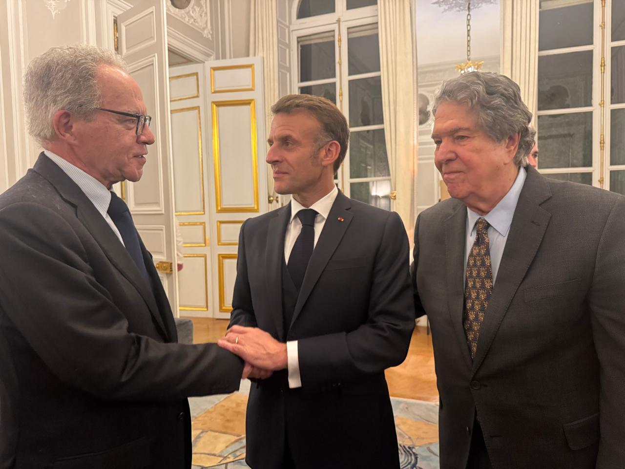 O empresário Nelson Tanure e o presidente do Conselho de Administração da Light, Hélio Costa, com o presidente Emmanuel Macron, da França, no Palácio Élysée. Na semana passada Foto: JB