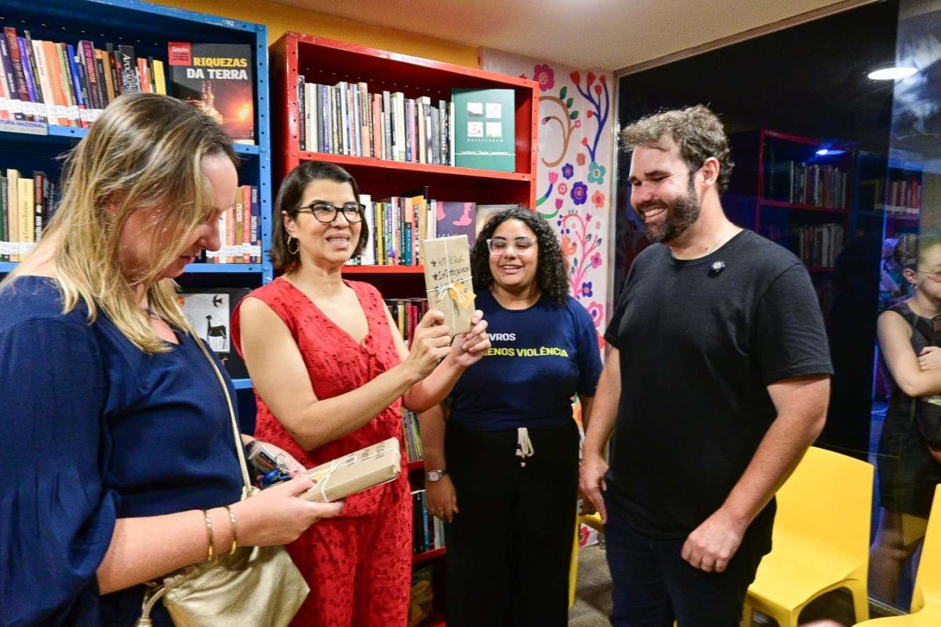 Da direita para a esquerda: Pedro Ivo, fundador da Biblioteca A Casa Amarela, no centro, de vermelho, Danielle Barros, Secretária de Cultura e Economia Criativa, do Estado do Rio de Janeiro, e Silvia Feil, gerente de Comunicação do MetrôRio Foto: divulgação
