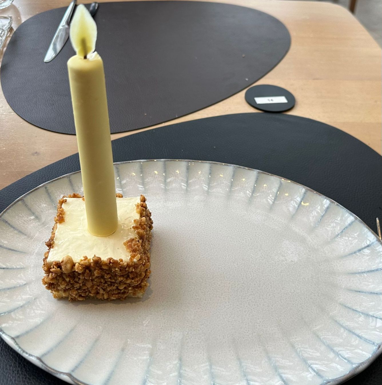 E então, como uma continuação delicada entre arte e vida, fui almoçar no restaurante Frank, dentro da própria Fundação Louis Vuitton. Ali existe uma tradição que me encanta: o restaurante cria uma sobremesa inspirada no artista em exposição. E, naquele dia, a homenagem era justamente a Kerze. A vela de Richter transformada em sobremesa. A chama realista, agora traduzida em textura, sabor e forma. Não era apenas um prato — era uma escultura linda e deliciosa. A arte deixava a parede.