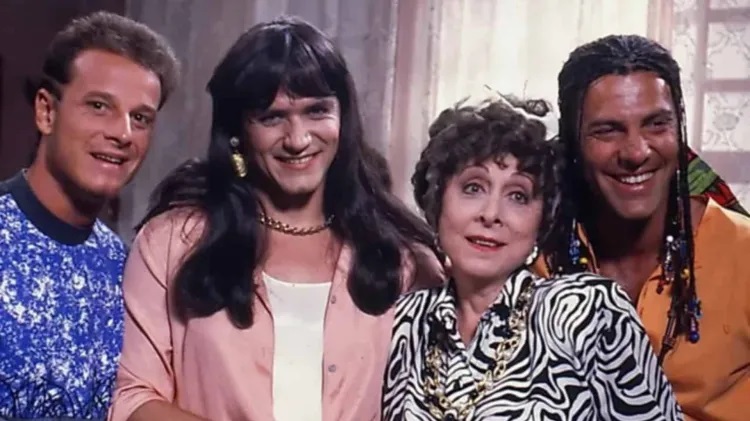 Gerson Brenner, à direita, com colegas de elenco da novela "Deus nos Acuda" Foto: reprodução de vídeo