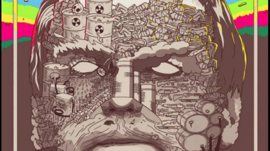 Um amontoado de barris de lixo tóxico, poluição e armas compõe um mosaico que dá forma ao rosto do presidente Jair Bolsonaro. A ilustração estampa o pôster do show do grupo feminista Pussy Riot.