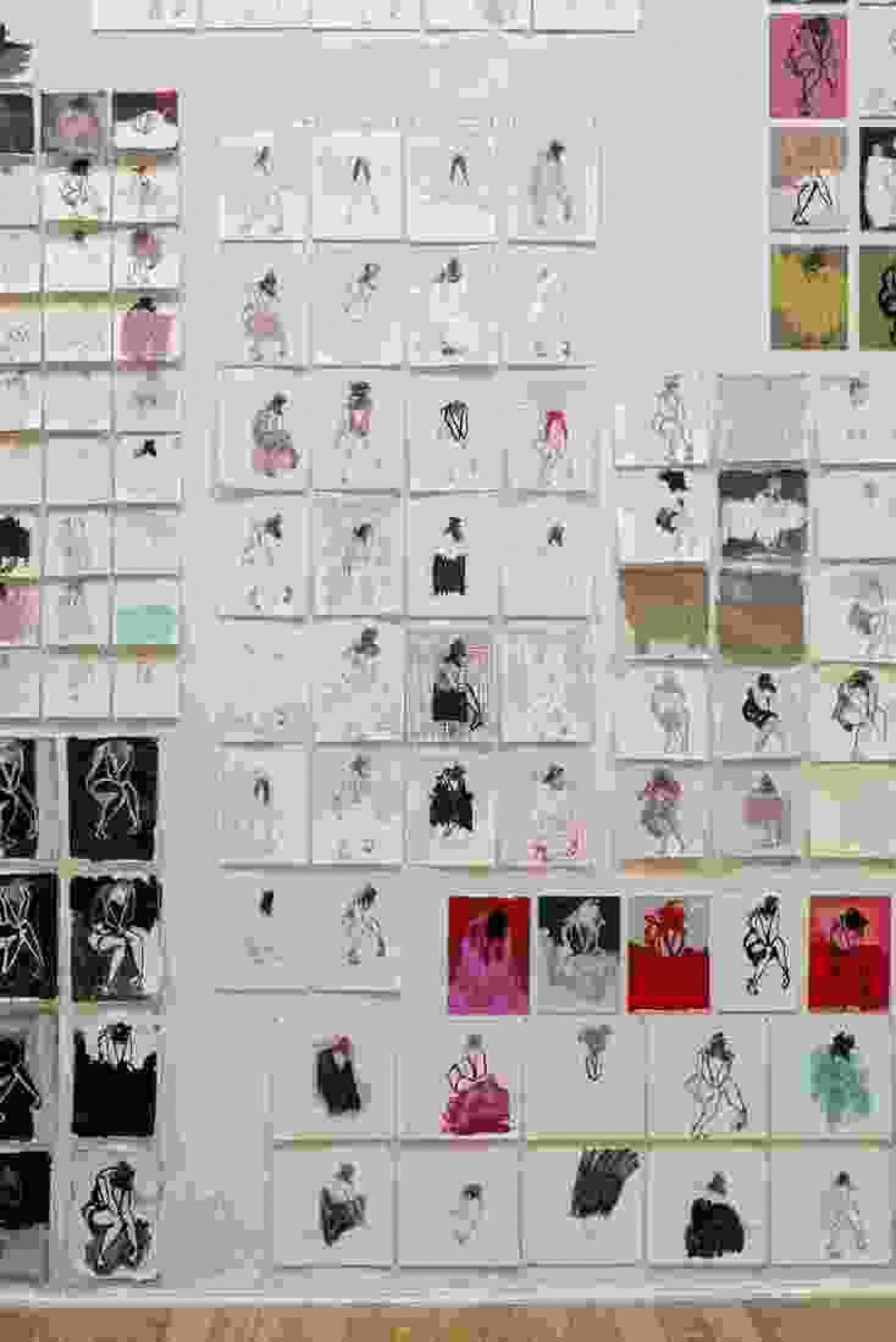 Conhecida pelas pinturas em grandes dimensões, a artista criou, para esta exposição, uma instalação com obras em pequenos formatos, com tamanhos máximos de 25cm X 35cm, que reproduzem uma mesma figura: uma mulher sentada, com as mãos nos ombros, a cabeça abaixada, as pernas e os pés tensos. Apesar de reproduzirem a mesma imagem, nenhum é igual ao outro. “Dependendo do ângulo, essa figura parece estar desesperada, cansada ou pensativa”, conta a artista.