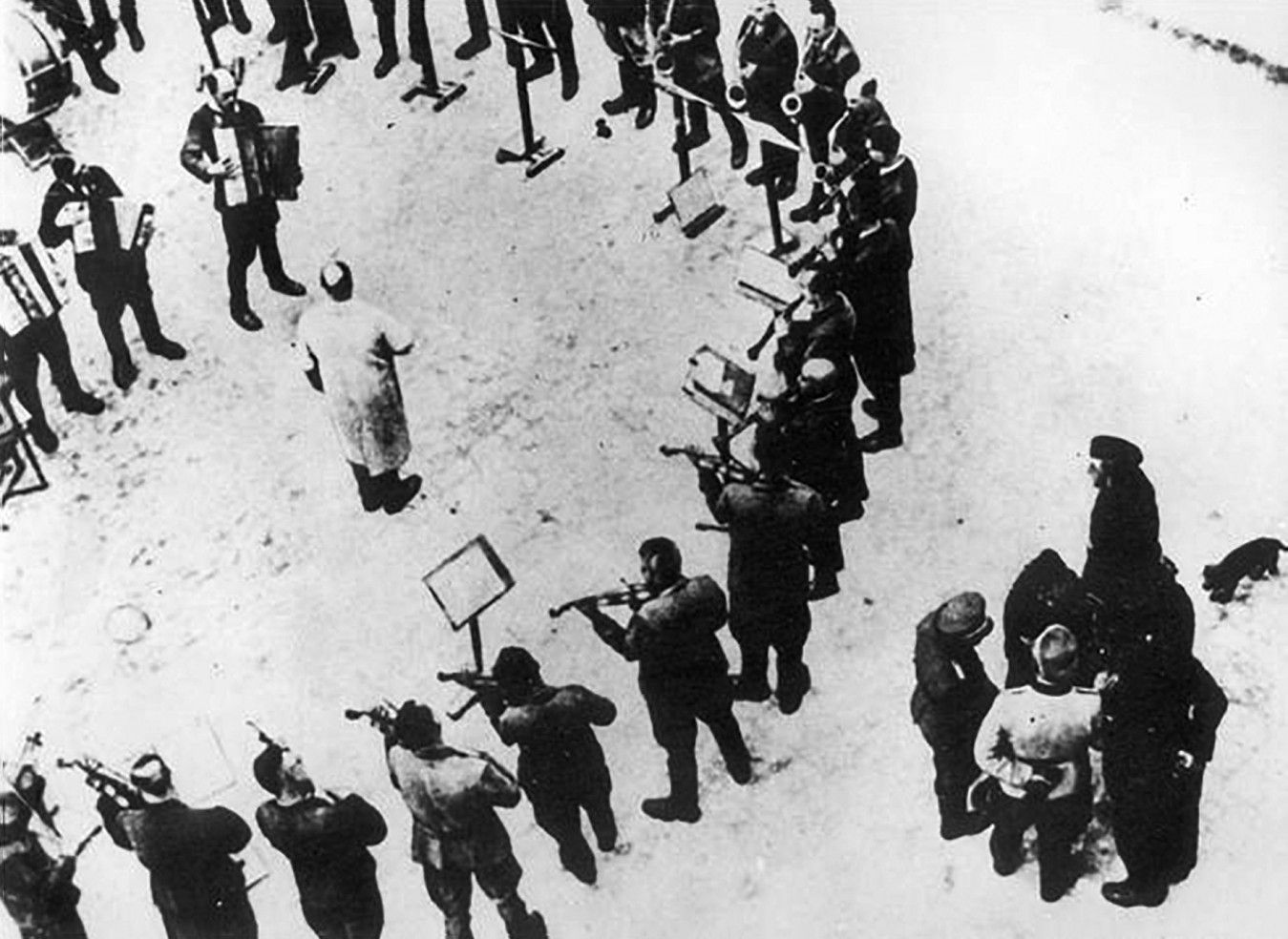 Membros da orquestra do campo de concentração de Janowska tocando em círculo ao redor do maestro Foto: divulgação