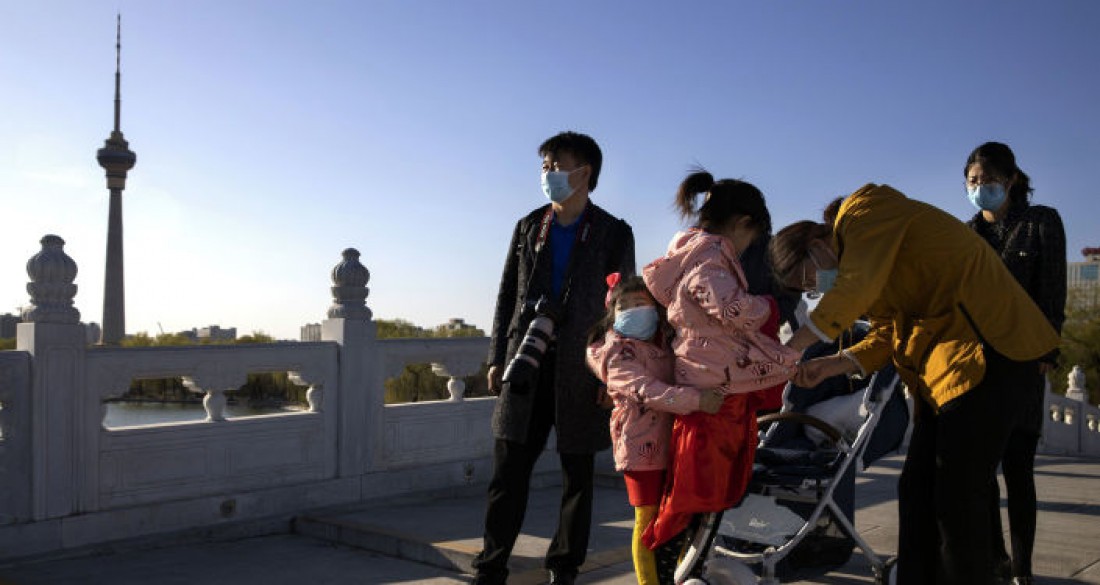 Família usa máscara e aproveita dia de sol em parque de Pequim AP Photo / Ng Han Guan