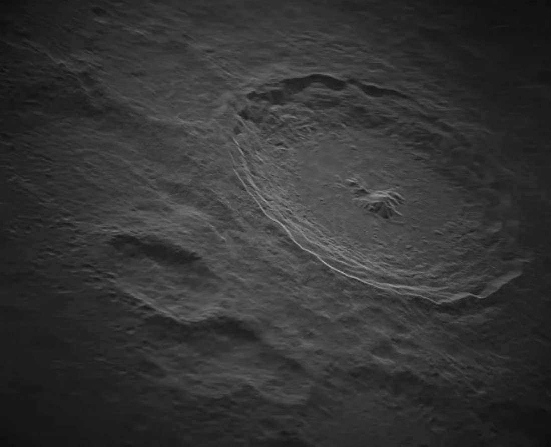 Imagem processada da cratera Tycho na Lua com resolução de cinco metros por cinco metros. A imagem mostra uma área de 200 por 175 quilômetros