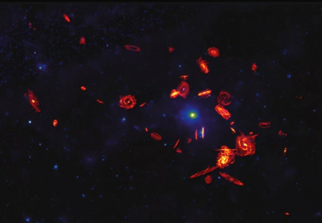 Galáxias observadas pelo telescópio Alma sobrepostas à imagem do gás quente no aglomerado de Virgem a 65 milhões de anos-luz da Terra Foto: Dagnello (NRAO)/Böhringer