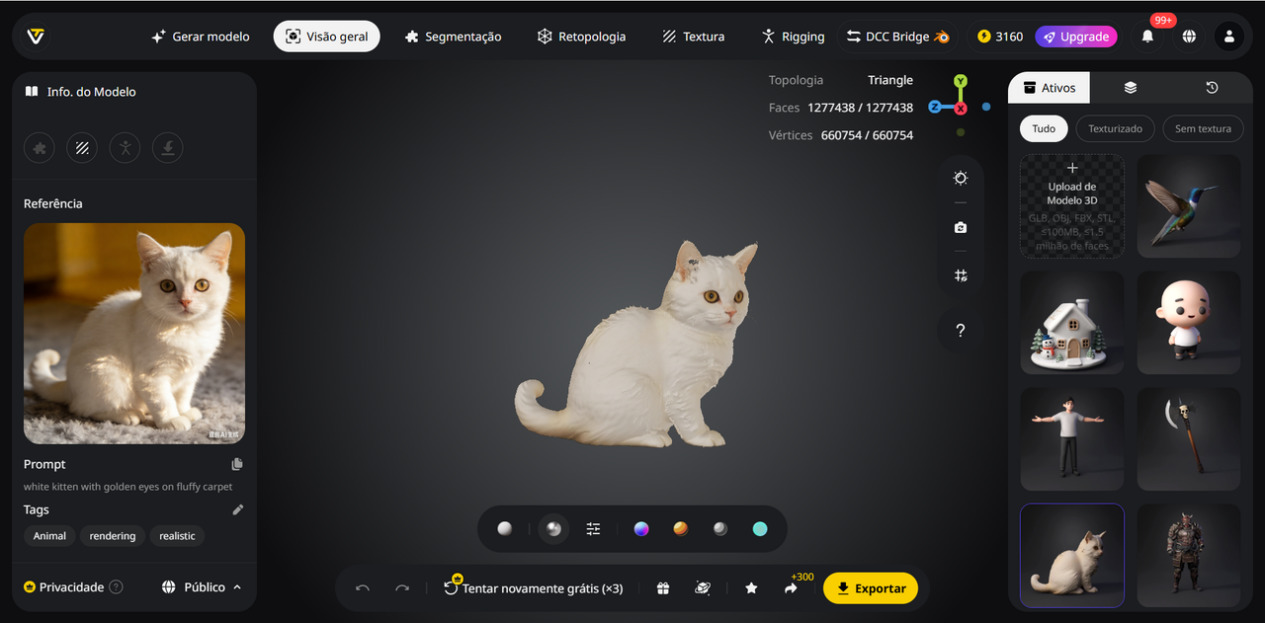 A retopologia manual é uma das etapas mais demoradas nos fluxos de trabalho 3D tradicionais. A Retopologia Inteligente deste gerador de modelo 3D com IA automatiza o processo ao analisar a geometria existente e gerar malhas limpas e otimizadas em quads ou triângulos, sem reconstrução manual.