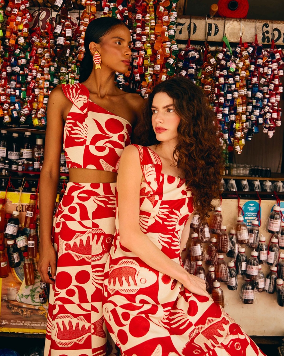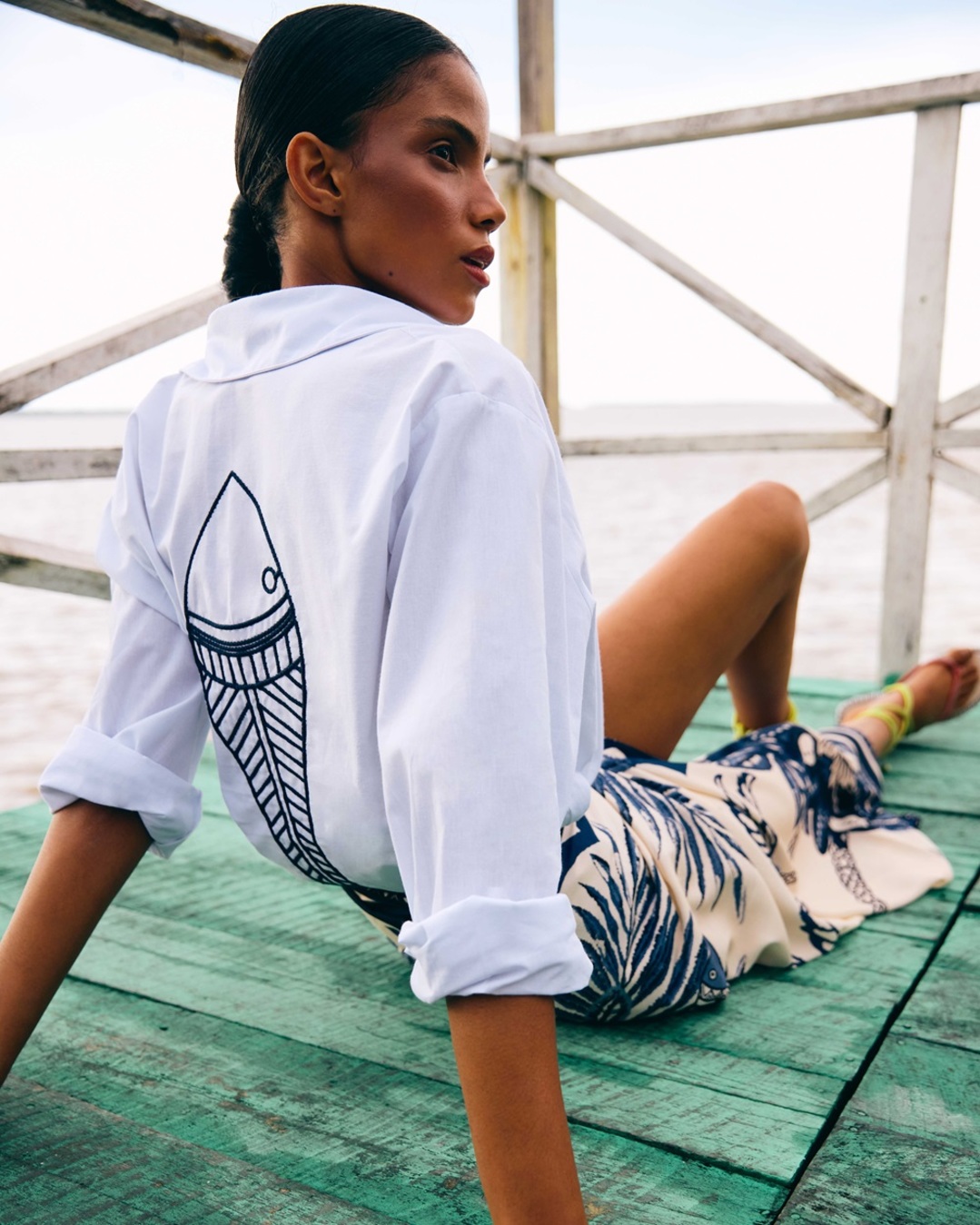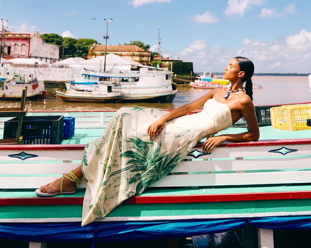 Em segundo lugar, a influência no visual. Na coleção da Cacay o verão é pura Amazônia, a começar pelo catálogo, produzido em Belém. Em linho, algodão, crepe e viscose, as peças azuis lembram as águas amazônicas, as estampas assinadas por Gabriela Coradesqui mostram o mercado Ver-o-peso, a bela Estação das Docas e a exuberância de Belém.