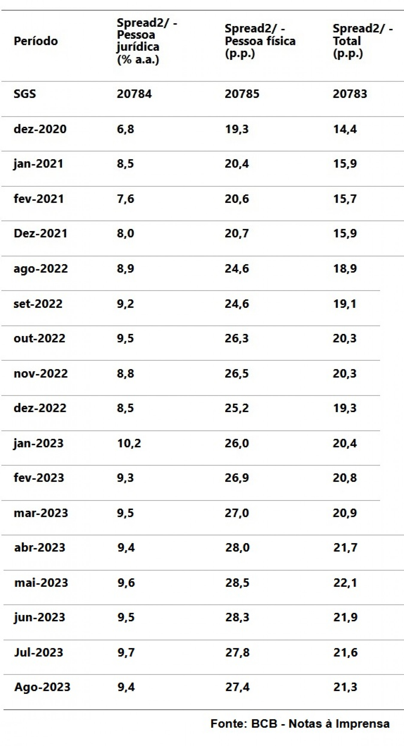 O texto a seguir é da Nota à Imprensa do BCB: “A taxa média de juros das novas contratações em agosto diminuiu 0,4 p.p. no mês e aumentou 1,7 p.p. comparativamente a agosto de 2022, ao situar-se em 30,7% a.a. O spread bancário das novas contratações atingiu 21,3 p.p., com queda de 0,3 p.p. no mês e aumento de 2,4 p.p. em 12 meses”.