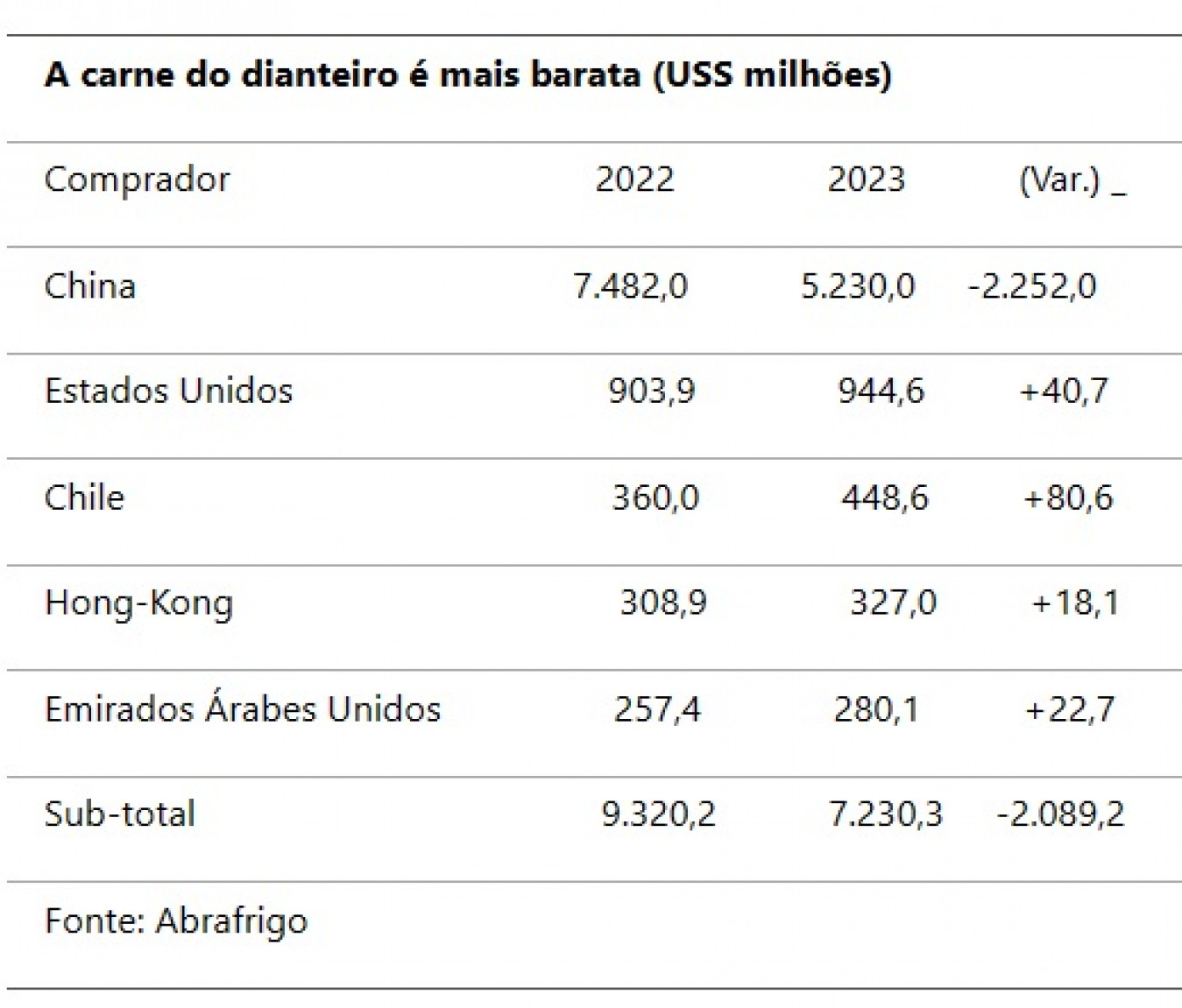 Com a recuperação da oferta de carne suína no país, os chineses, que são econômicos, reduziram a pressão compradora e as cotações caíram ainda mais com a preferência pela carne do dianteiro. De janeiro a novembro as compras chinesas de carne caíram em preços e em tonelagem, com redução total de US$ 2,252 bilhões nas receitas, segundo a Associação Brasileira de Frigoríficos (Abrafrigo). Isso provocou queda de US$ 12,239 bilhões nas vendas totais de carne bovina, em 2022, para US$ 9,754 bilhões este ano.
