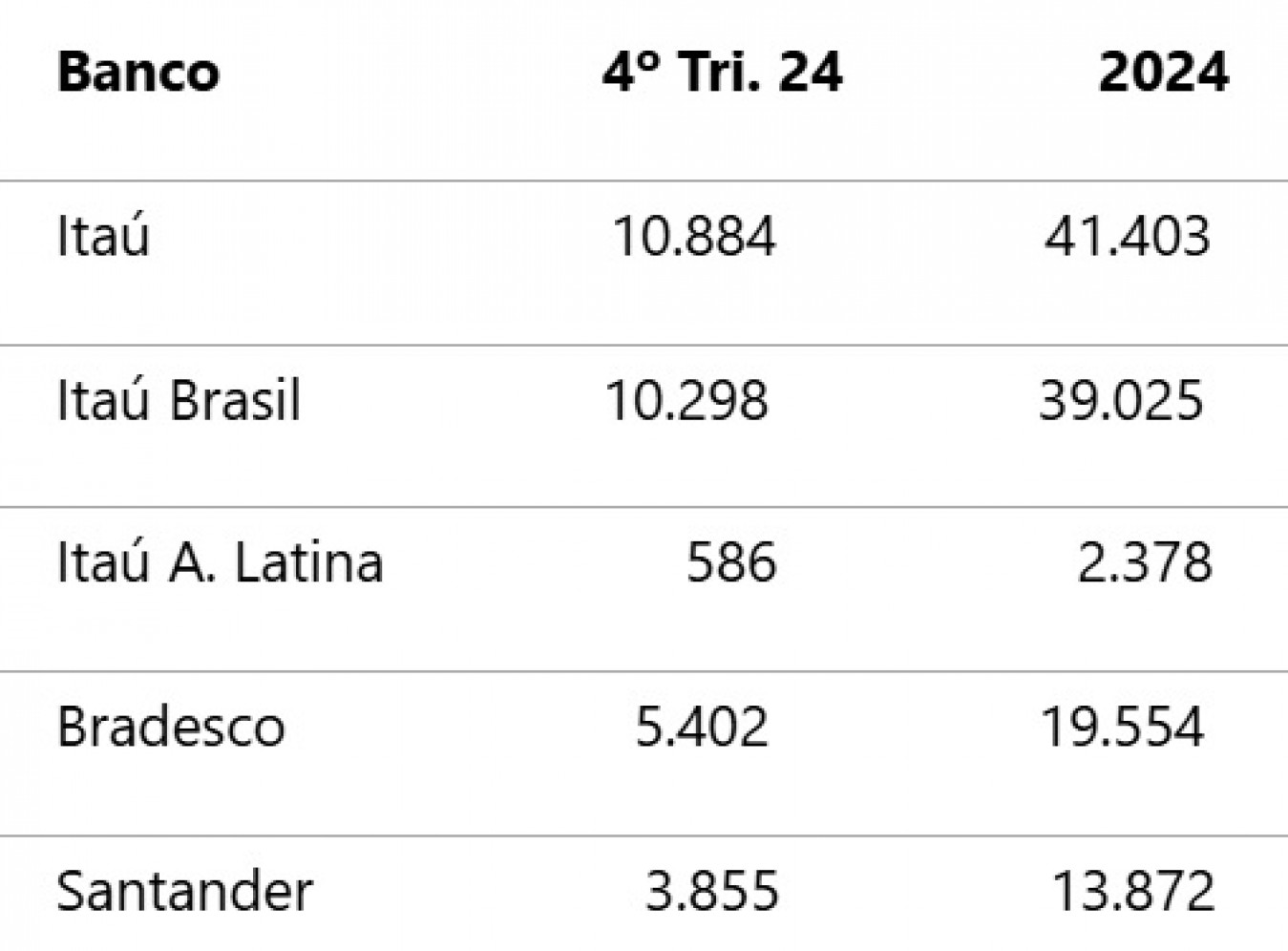 O Itaú divulgou seus resultados consolidados (incluindo operações na América Latina) que somaram lucro recorrente de R$ 10,884 bilhões no 4º trimestre e R$ 41,403 bilhões. São números impressionantes quando se comparam aos do Bradesco e do Santander, que divulgou resultados na quarta-feira, 5, com lucro trimestral recorrente de R$ 3,855 bilhões e R$ 12,872 bilhões no ano. Os resultados globais do Itaú somam mais do que o dobro do Bradesco no 4º trimestre e no ano e quase o triplo do Santander nas duas métricas.