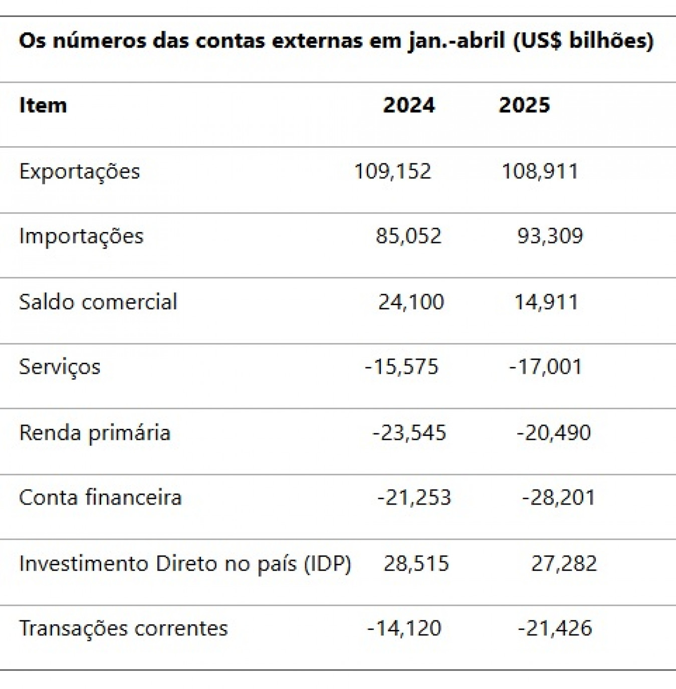 Na comparação interanual, o superávit comercial diminuiu US$ 352 milhões, mas houve recuo nos déficits em renda primária (US$ 550 milhões) e em serviços (US$ 98 milhões), e aumento do superávit em renda secundária (US$ 79 milhões). O déficit em transações correntes em 12 meses até abril de 2025 somou US$ 68,5 bilhões (3,22% do PIB), ante US$ 68,9 bilhões (3,23% do PIB) em março de 2025 e US$ 26,7 bilhões (1,18% do PIB) em abril de 2024.