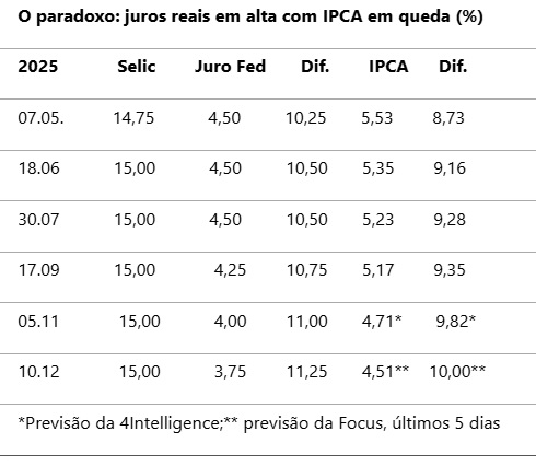 Em 7 de maio, quando o Copom manteve a Selic em 14,75% [mas já devia ter informações de que o IPCA de abril, que o IBGE divulgou dia 9 de maio, escalara para 5,53%, a maior taxa anual deste ano], o juro real era de 8,73%. Em junho, ao subir para 15,00%, confrontado com o IPCA de 5,32% em maio, subiu para 9,2%. Mantida em 15%, à medida que o IPCA cedia, o juro real aumentava. Se a previsão da 4Intelligence se confirmar, o juro real terá aumentado para 9,8% este mês.