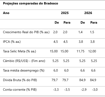 Ao atualizar o cenário na noite de sexta-feira, 7 de novembro, o Bradesco considerou a desaceleração do PIB neste semestre “bastante alinhada à (sua) expectativa. Desde a virada do ano, vínhamos projetando estabilidade da economia na segunda metade de 2025. No entanto, há sinais de que pode haver alguma reaceleração no primeiro trimestre de 2026”, adverte. Isso pode ser lido como uma resistência ao Copom baixar os juros em 28 de janeiro, deixando para fazê-lo em 18 de março.