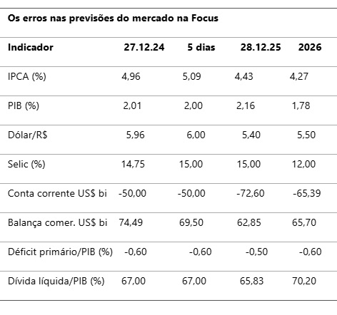 Outro front de erros foi o das finanças públicas. Os economistas do mercado não acreditaram nas projeções de arrecadação com cobranças judiciais e criação de impostos compensatórios sobre os mais ricos. Houve previsão de déficit primário (receitas menos despesas, sem contar os juros da dívida) de R$ 100 bilhões (ou 1% do PIB). Na mediana, a aposta era de -0,60; em 28 de novembro, o mercado cortou a estimativa a -0,50% e previu -0,60% para 2026.