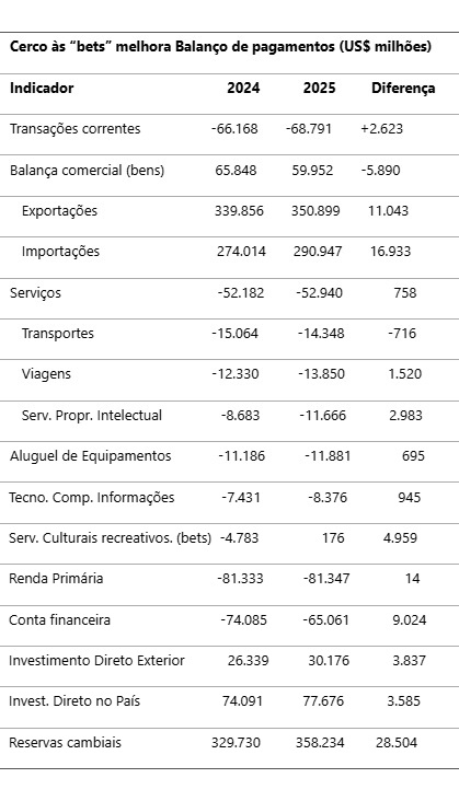Entretanto, o governo Lula conseguiu economizar quase US$ 5 bilhões com a decisão do ministro da Fazenda, Fernando Haddad, de fechar o cerco sobre as “bets” e obrigar as casas de apostas (desde janeiro de 2025) “a tornarem-se empresas residentes, fazendo com que as transações de apostas deixassem de fazer parte do balanço de pagamentos". Em 2024, as “bets” geraram déficit de US$ 4,783 bilhões, transformado em superávit de US$ 176 milhões em 2025 (uma redução total de US$ 4,959 bilhões nas despesas líquidas de serviços culturais pessoais e recreativos).