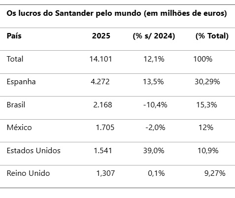 O Santander Brasil, maior operação do banco de Ana Botin, que, junto com a compra do Western Bank, com 8 milhões de clientes, que eleva a carteira global a 180 milhões de clientes, anunciou lucro global em 2025 de 14,101 bilhões de euros, um aumento de 12,1% sobre 2024 teve queda de 2,8% nos lucros em 2025 a 2,168 bilhões de euros e de 10,4% em euros constantes.