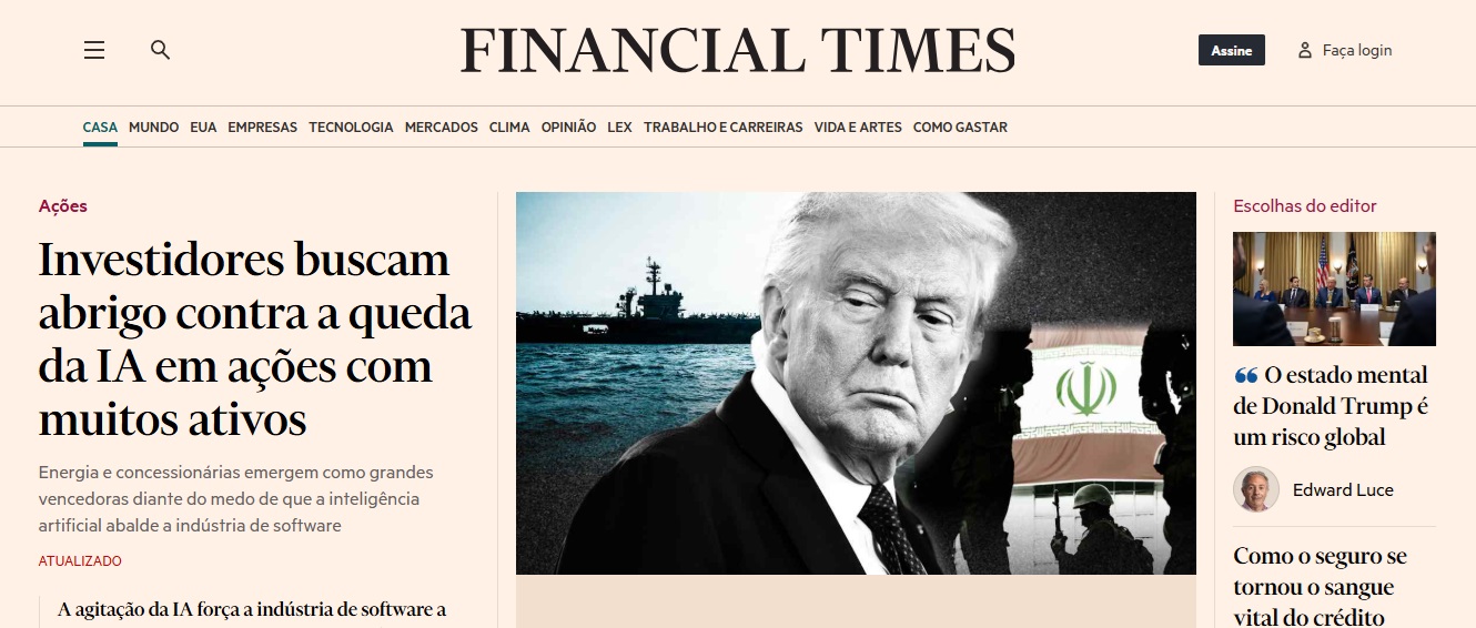 O FT expõe essa opinião ao mesmo tempo em que informa na sua principal manchete que o presidente da Ucrânia, Volodymyr Zelensky, disse, em entrevista exclusiva ao jornal, que “a guerra na Ucrânia está no começo do fim”; ele incentivou o presidente Trump a “enxergar através dos ‘jogos’ da Rússia”. Para terminar, a capa que duvida da sanidade do principal líder mundial expõe, abaixo de uma grande foto do principal líder mundial, a legenda: ‘Crise causada por ele mesmo’: Trump pondera mais uma guerra com o Irã.