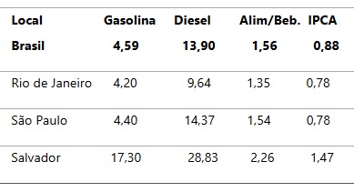 Enquanto a gasolina subia 4,20% no Rio de Janeiro e 4,40% em São Paulo e 4,59% na média nacional, a Acelen, situada no Recôncovo baiano, junto à capital, importa petróleo a preços de mercado, e reajustou a gasolina pesadamente. Em Salvador, a pesquisa do IBGE encontrou alta de 17,37% na gasolina nos postos. No diesel, a alta foi de 28,83%, com forte repasse aos preços dos alimentos e bebidas. Imagina se a Petrobras tivesse privatizado 50% de suas refinarias e os preços dos combustíveis domésticos acompanhassem os reajustes do PPI aposentado em maio de 2023?