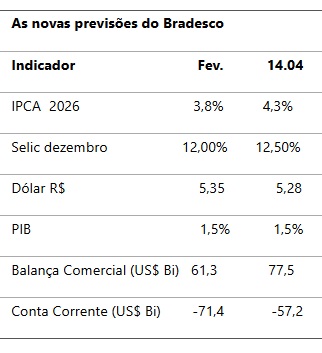 Não foi só o Fundo Monetário Internacional (FMI) que reviu o crescimento da economia mundial devido à Guerra no Golfo Pérsico. O Bradesco também reviu para cima a previsão da inflação do IPCA, reajustada de 3,8% para 4,3% (ainda é das mais otimistas) e, com isso, elevou a previsão da Selic no fim de ano (hoje em 14,75%), de 12,00% para 12,50% ao ano. Para 2027, manteve em 9,50%. O Bradesco manteve a previsão do PIB 2m 1,5%, abaixo da do FMI.