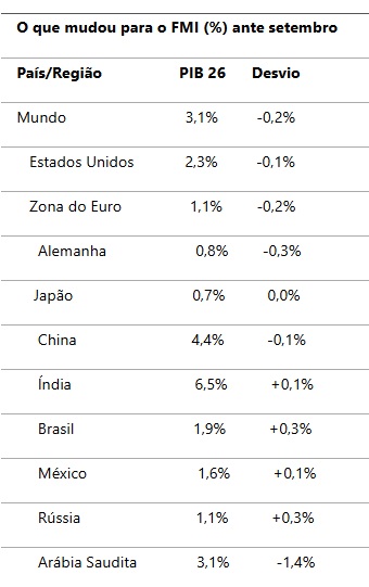O FMI espera uma queda de 0,2% da economia mundial (de 3,3% para 3,1%) frente às previsões de setembro. Os Estados Unidos devem ter redução de 0,1%, para 2,3%. A economia da Zona do Euro encolhe 0,2% para 1,1% (a Alemanha recua 0,3% para 0,8%). O Japão fica estável em 0,7%. Mas a China recuaria 0,1% para 4,4%, ao contrário da Índia, que lidera o crescimento com 6,5%, avanço de 0,1%.