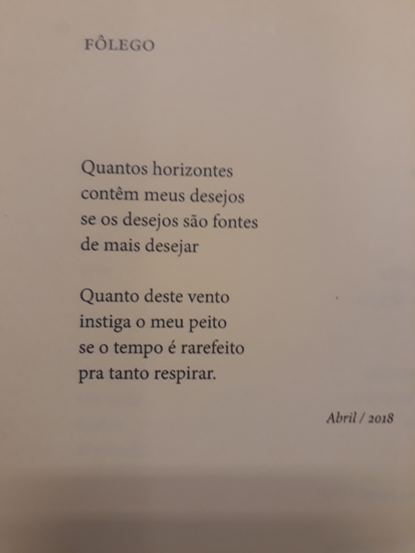 E é o ar que abre e fecha o livro com os poemas “Fôlego” (“Quantos horizontes/contêm meus desejos/se os desejos são fontes/de mais desejar/Quando deste vento/instiga o meu peito/se o tempo é rarefeito/pra tanto respirar”) e “Ritmo” (“Não podes respirar/se não esperas o ar/que te inspira/e morres sufocado/se só esperas o ar/e não respiras.”).