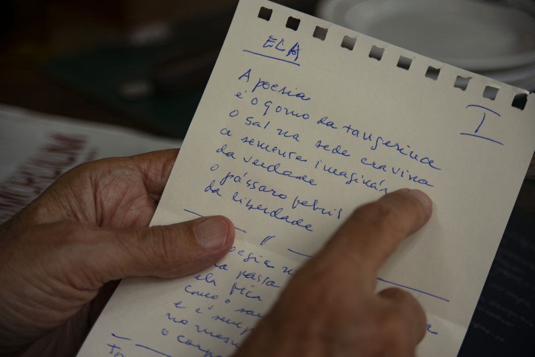 Em “Fôlego”, o novo livro de Abel Silva, com exceção de dois escritos em 2016, traz uma produção bem recente, de poemas datados de 2017 para cá. “Eu já tinha uns 20 poemas e ainda não havia pensado em um título”, lembra. Na época, ele foi a uma consulta em que o médico informou sobre a necessidade de fazer uma cirurgia de desvio de septo. “Aí eu enrolei, dizendo que daqui a alguns meses voltaria... foi quando ele me disse: ‘Abel, um poeta tem que ter fôlego!’. Pronto. Desandei a escrever”, conta. Outra particularidade da edição é que a capa e contracapa - com um texto manuscrito - foram feitas pelo próprio Abel.