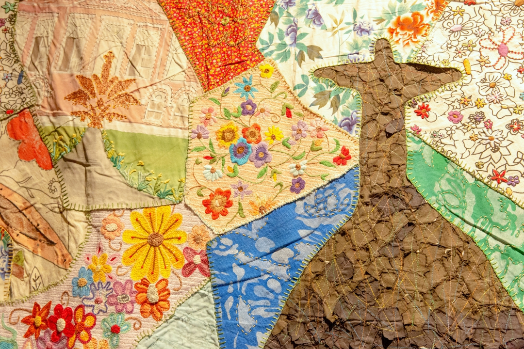 A mostra é dividida em três ambientes e propostas que resumem a trajetória do artista. No espaço principal, batizado de Sala Cidade, o destaque é o conjunto de 15 painéis bordados produzidos em oficinas de cidadania e sustentabilidade que o artista promove em comunidades como Maré, Rocinha, Cidade de Deus e Complexo do Alemão desde 2002. São grandiosas peças de cerca de dois metros de altura cuidadosamente costurados por artesãos locais. “Nas oficinas, discutimos a concepção da obra que ora se valem de diferentes técnicas de bordado ora utilizam pintura em tecido. Definido o quebra-cabeças, eles vão para a finalização que é a etapa mais demorada”, conta. Peças dessas dimensões podem levar de oito meses a um ano para serem concluídas.