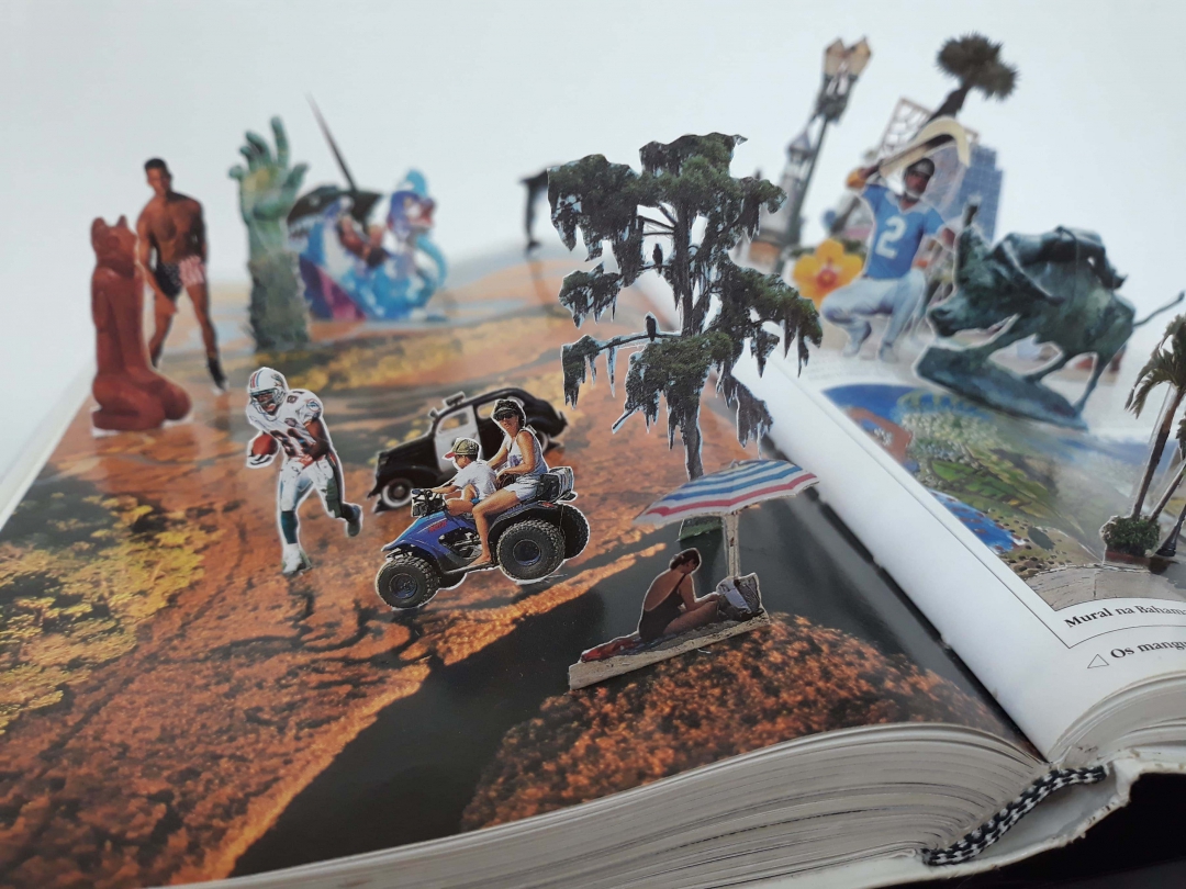 Numa composição inusitada, o pintor Daniel Lannes coloca D. Pedro II no divã de Sigmund Freud, o pai da psicanálise na tela “Complexo de vira-lata”. Em “Florida 266-267 (The World)”, de 2018, o escultor Daniel Escobar monta paisagens com recortes de guias de turismo que saltam aos olhos através de um relevo, numa linguagem que remete aos pop-ups da internet e rompe as os limites do volume impresso. “A obra cria um foco crítico em relação ao próprio sistema de arte e sua sintonização com a circulação de pessoas e produtos pelo mundo”, diz o artista, em alusão à indústria do turismo.