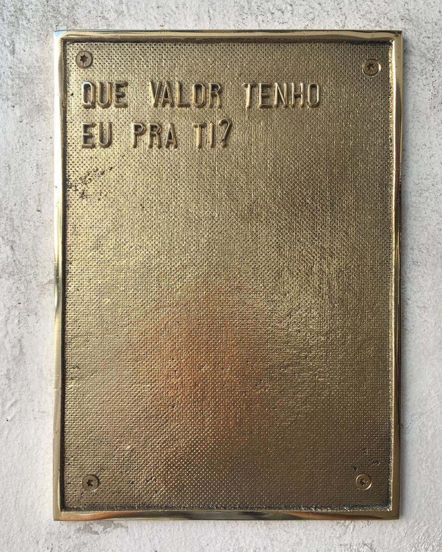 Em “Que valor tenho eu pra ti?” (2018), Ivan Grilo apresenta uma placa em bronze que dialoga com as peças da série “Escribe una carta de amor”, que recentemente passou da coleção do Pérez Art Museum Miami.