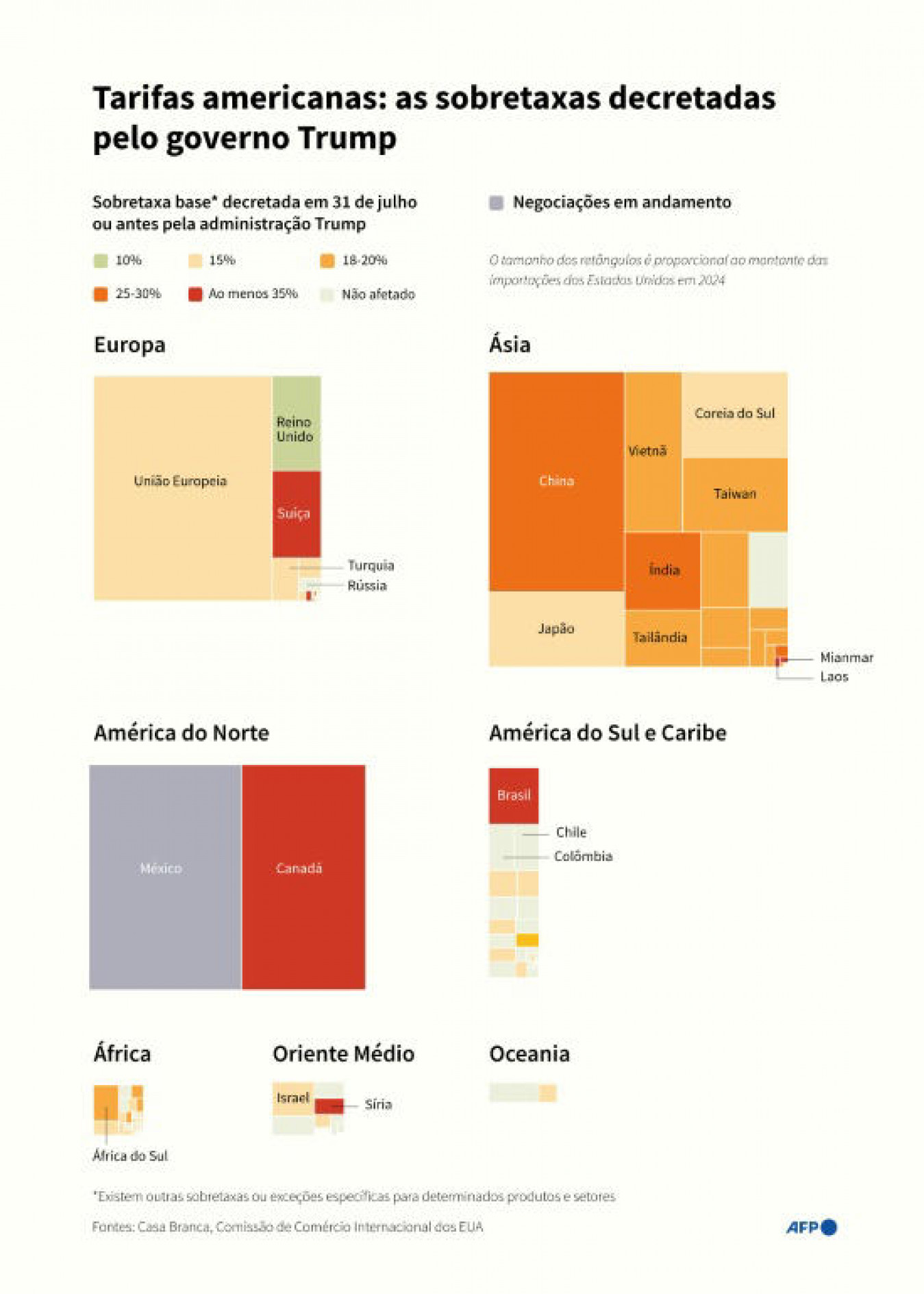 Montante das importações americanas por região, indicando as sobretaxas alfandegárias decretadas pela administração Trump para cada país em 31 de julho ou antes Imagem: Julie Pereira