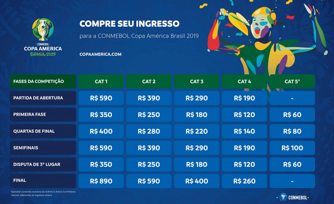 Começa às 18h desta quinta-feira a primeira fase da venda de ingressos para a Copa América, que será realizada entre 14 de junho e 7 de julho, no Brasil. O valor dos bilhetes varia de R$ 120 a R$ 890 - os jogos na Arena Corinthians e do Grêmio terão ainda uma categoria com ingressos a R$ 60, já que os dois estádios possuem uma área sem cadeiras.