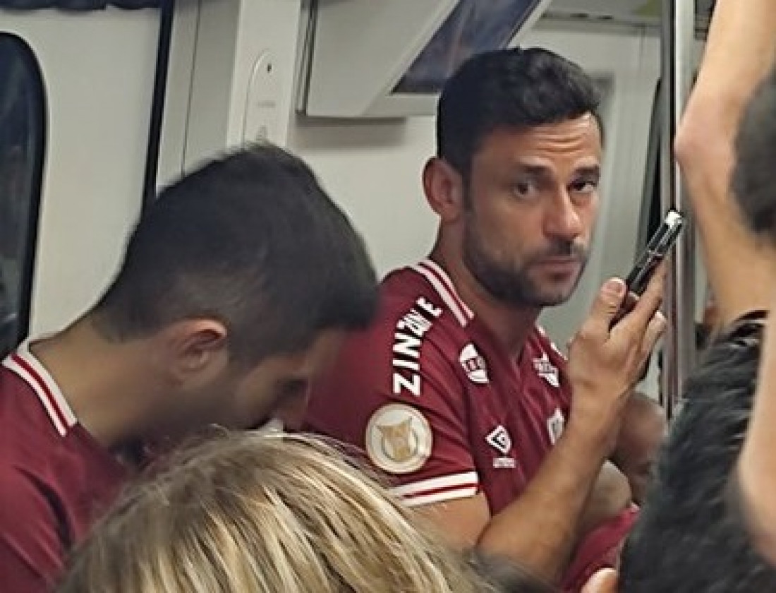 Hoje aposentado, o ídolo tricolor Fred foi assistir ao jogo de metrô, com o filho nos braços reprodução da internet