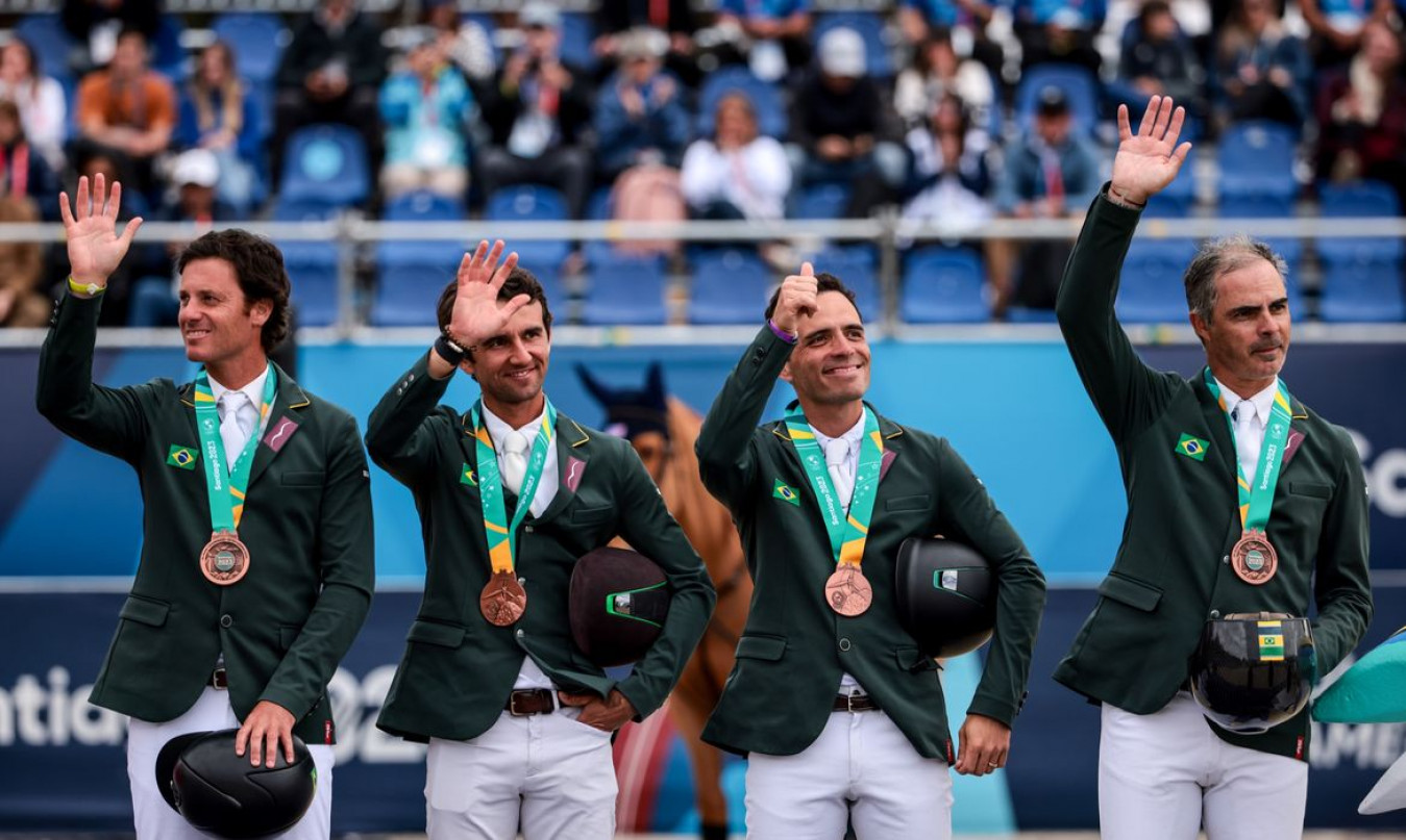 A equipe brasileira de hipismo conquistou a medalha de bronze na disputa por equipes de saltos nos Jogos Pan-Americanos de 2023, disputados em Santiago (Chile). O feito foi alcançado nesta quarta-feira (1), na Escola de Equitação do Exército do Chile, na cidade de Quillota, por Rodrigo Pessoa, Marlon Zanotelli, Pedro Veniss e Stephan Barcha. O ouro ficou com os Estados Unidos e o Canadá com a prata.
