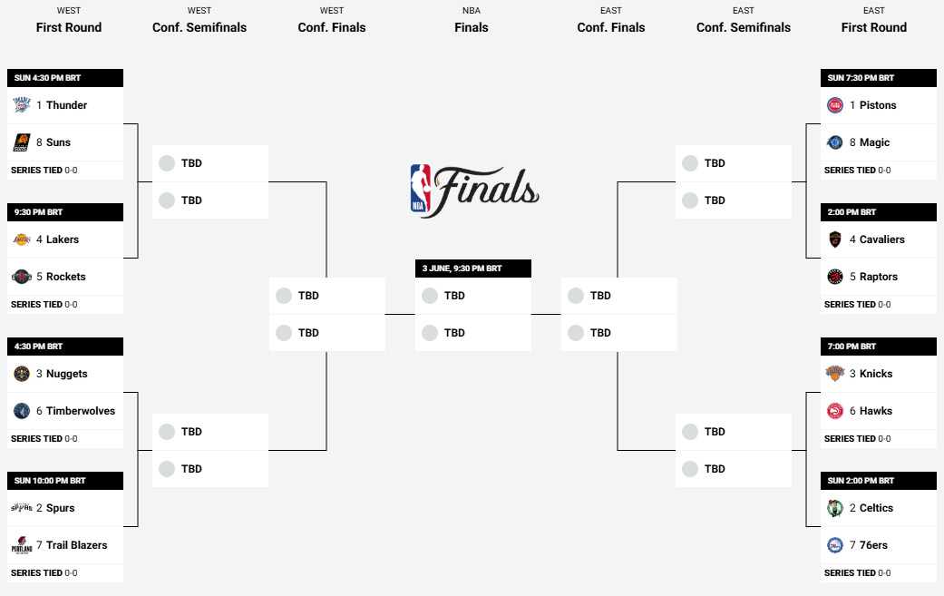 Será este o último ano de LeBron James no Lakers? O Oklahoma City Thunder vai confirmar seu favoritismo? Spurs e Pistons já são realidades, ou não? Vamos descobrir. Veja abaixo os confrontos: