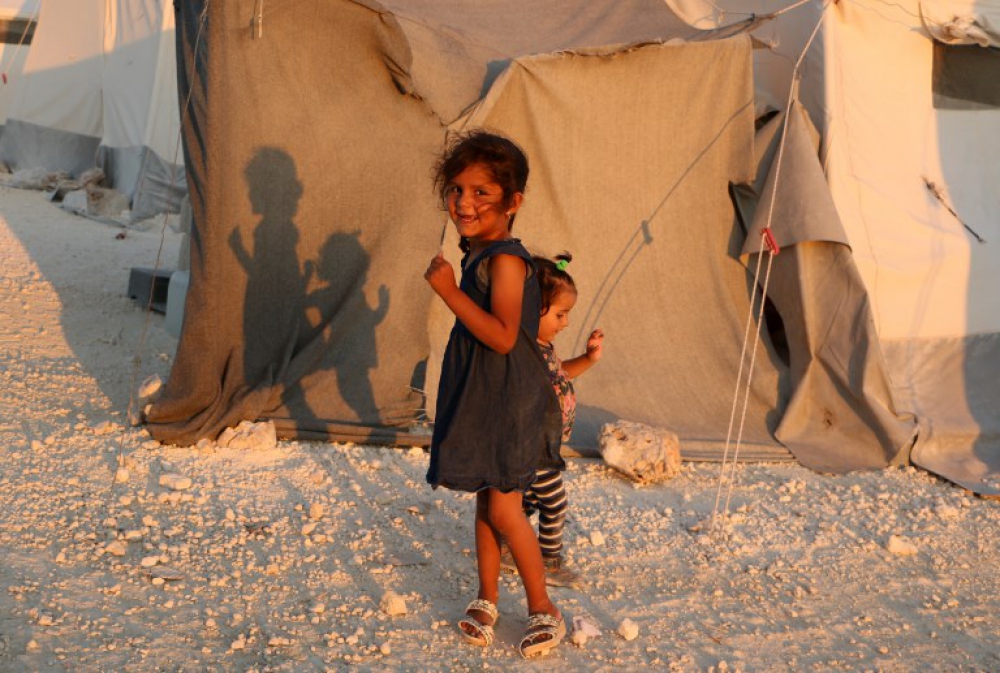 Meninas sírias desabrigadas ao lado de uma tenda fornecida por uma organização humanitária turca em Idlib