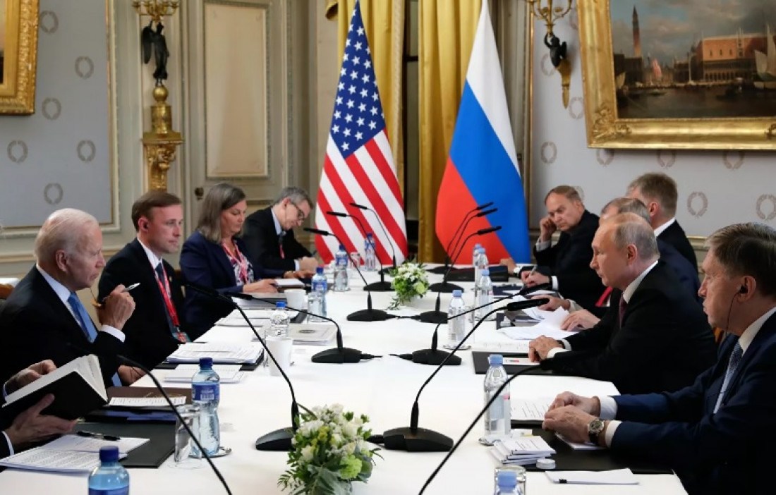 Delegações da Rússia e dos EUA participando da cúpula em Genebra, 16 de junho de 2021 Foto: Sputnik / Mikhail Mettsel