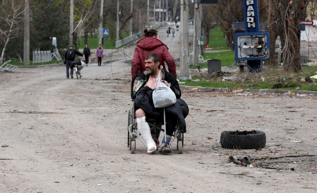 Mulher puxa uma cadeira de rodas transportando homem ferido em uma rua durante o conflito Ucrânia-Rússia na cidade portuária de Mariupol; 18 de abril de 2022 Foto: Reuters/Alexander Ermochenko