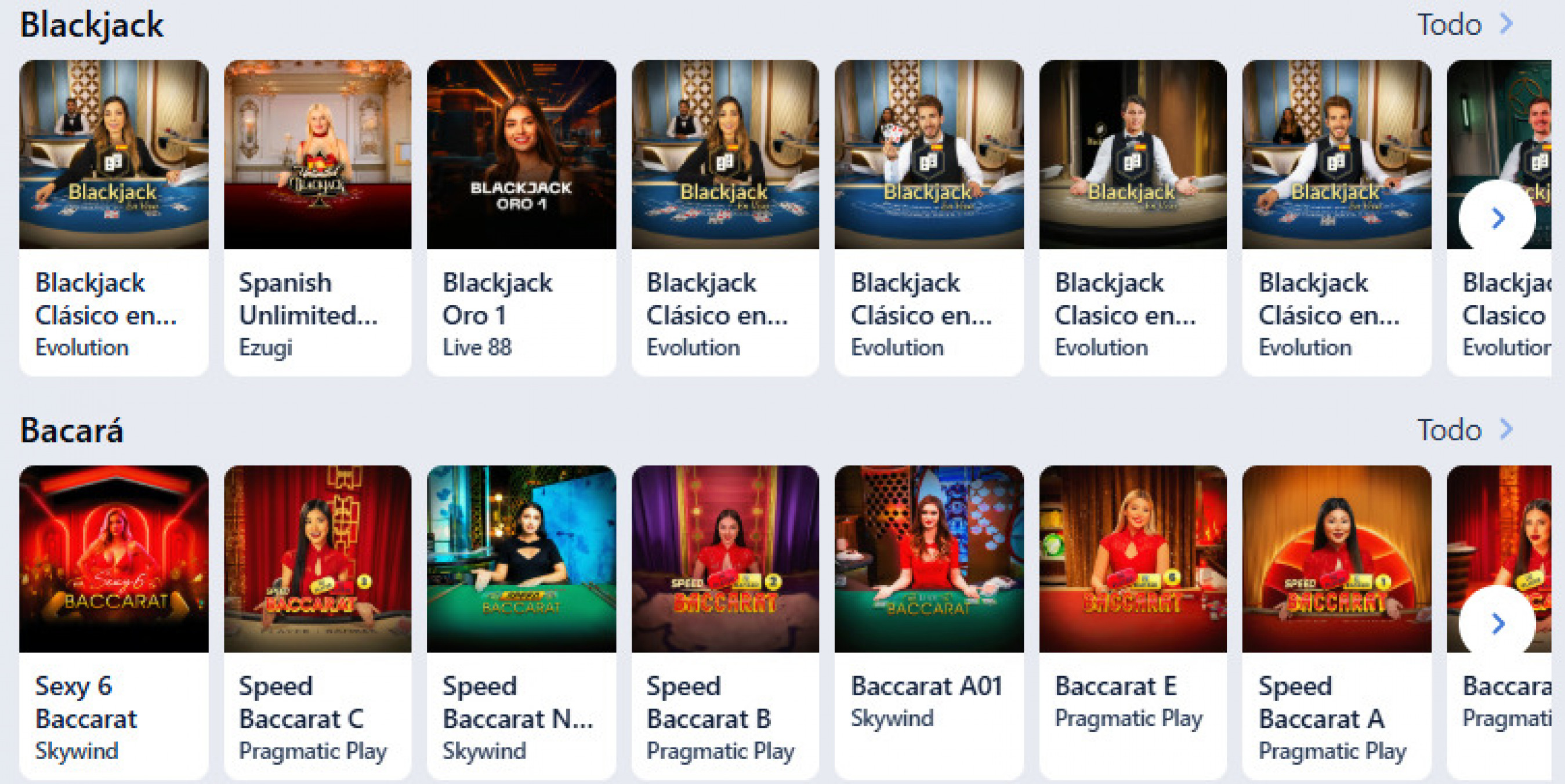 En esta sección se encuentran múltiples variantes de blackjack, ruleta, baccarat y póker, junto a juegos interactivos tipo show. Puedes elegir por idioma, tipo de apuesta o dinámica de juego.