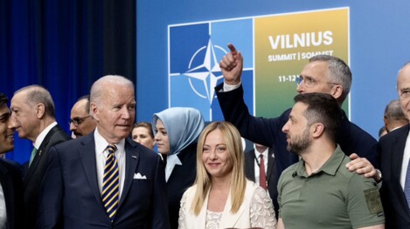 Meloni ao lado de Biden e Zelensky durante a cúpula da Otan
