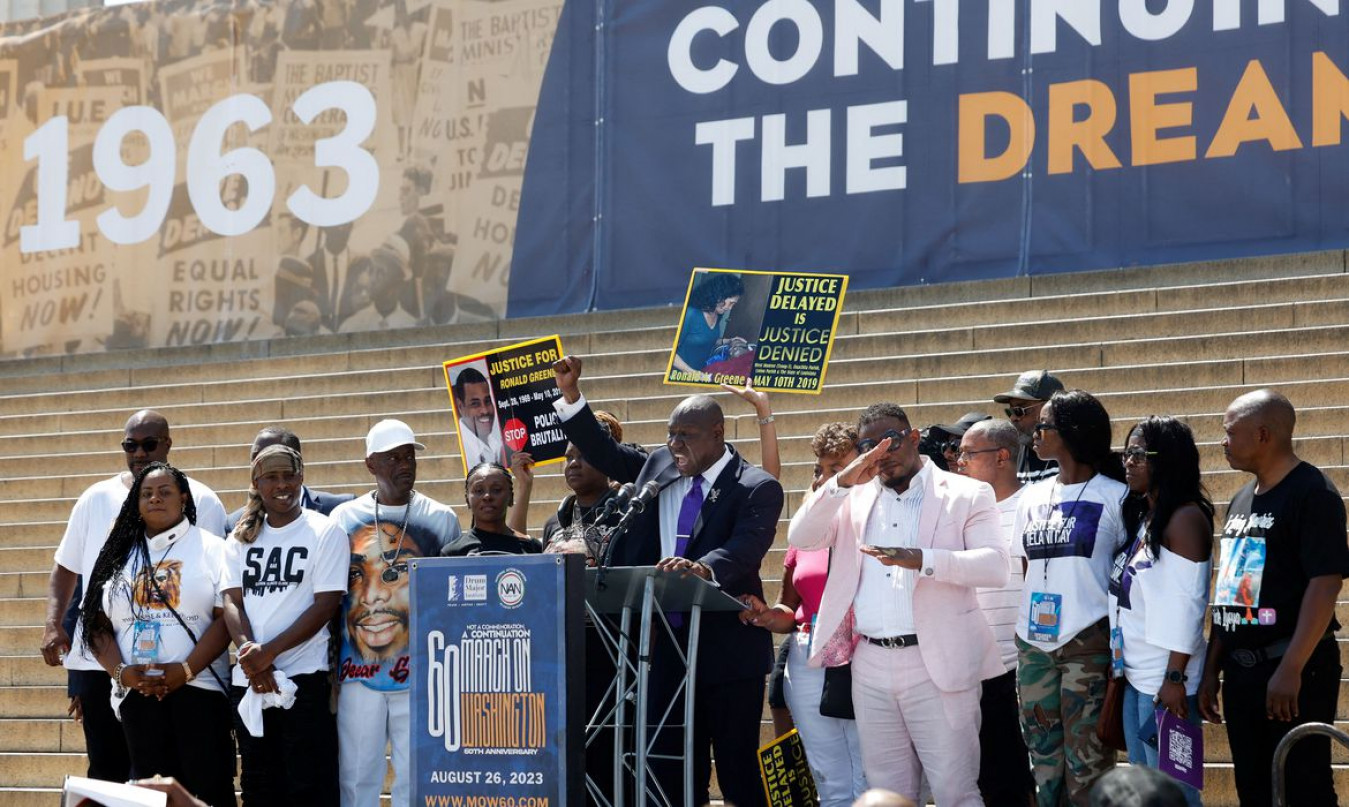 A manifestação deste ano foi realizada no Lincoln Memorial, o cenário da cobrança apaixonada de King por igualdade, e muitos dos oradores alertaram que ainda há muito trabalho pela frente. Eles condenaram a violência armada contra o povo negro, enquanto o público cantava Sem Justiça, Sem Paz.
