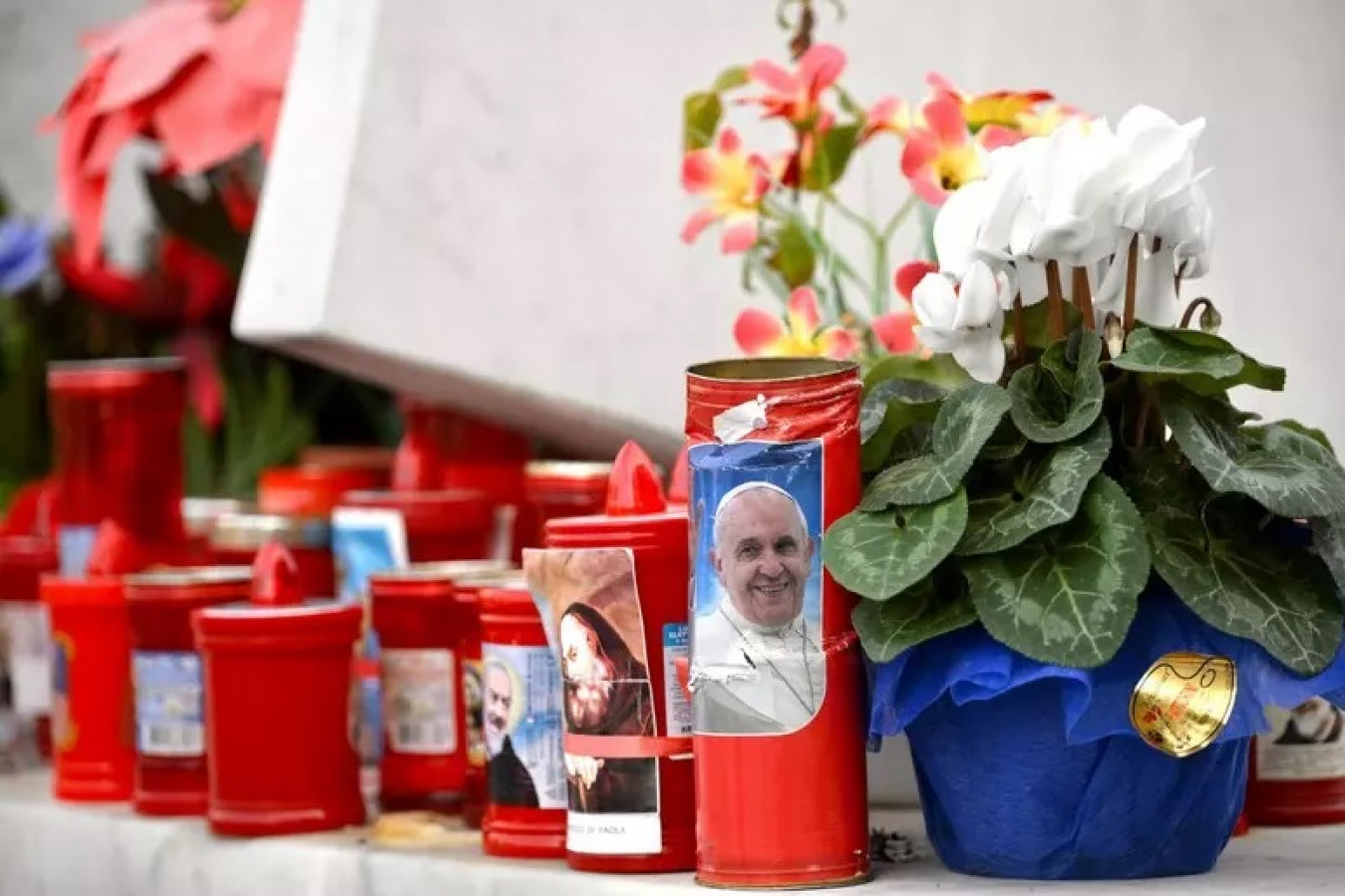 Velas para o papa Francisco do lado de fora do Hospital Agostino Gemelli, em Roma